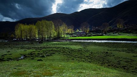 湛藍(lán)的天空下,雄鷹在盤旋,牛羊在安詳?shù)芈匠圆?,靜靜的小河在山邊蜿蜒流淌,充滿綠意的白楊樹在風(fēng)中搖曳,藏式民居不時升起縷縷炊煙,寂靜、空曠的原野深處偶爾會傳來幾聲狗叫高原的陽光又賦予這幅風(fēng)景畫凝重的色彩這樣的畫面叫人心醉,讓人留戀忘返從折多山腳下至新都橋鎮(zhèn),再至塔公草原,處處都是入畫的美景,不愧稱為“攝影家的天堂”。
