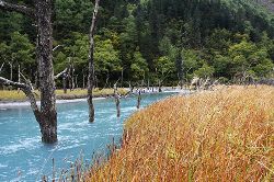 這里森林茂密,河流縱橫,生態(tài)原始,很多古樹浸泡在河水、沼澤之中,姿態(tài)怪異,神秘莫測,猶如置身侏羅紀時代。傳說這里是東巴神話《創(chuàng)世紀》的發(fā)祥地。