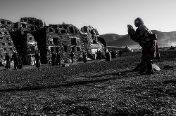 石經(jīng)城位于距石渠縣城呢呷鎮(zhèn)東北約90公里處的阿日扎鄉(xiāng)境內(nèi),坐落在雅礱江支流洛曲河西岸一處兩山相望的草原間,背靠一座平緩、渾圓的山丘,前面是一望無際的草原,由于草原極為遼闊,遠(yuǎn)遠(yuǎn)望去,整座城并不顯得特別雄偉、壯觀,但走近細(xì)看,這座用一塊塊刻滿經(jīng)文和佛像的石片、石塊在漫長歲月中逐漸壘砌起來的石城,所蘊含的厚重與蒼茫,堅韌與神秘,讓我想起荷爾德林所說的“那些四處飄游的分散的力量,都匯聚在一個黃金般的中心”。