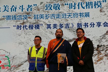 在分享會舞臺的一側(cè),靜置著書籍《雪線信使——“時代楷模”其美多吉》放大后的封面。封面上,其美多吉、藍(lán)天與雪山相得益彰,構(gòu)成了一幅獨具特色的畫面。