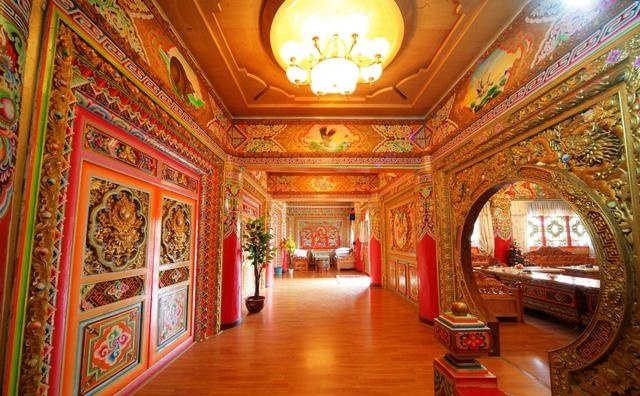 道孚民居室內(nèi)精雕細鏤,描金繪彩,每一個圖案或圖畫就是一個吉祥物或一個傳說。民居客廳陳設豪華,富麗堂皇,極顯主人的富有;經(jīng)堂供奉佛像,酥油燈長明,是家中的清靜之地;臥室多用箱式或椅式藏床,陳設溫馨而別具風情。