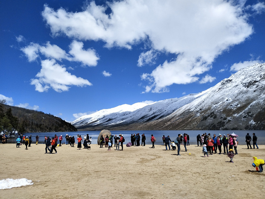 4月30日,筆者來到木格措景區(qū),看到售票大廳內(nèi)人頭攢動(dòng),人氣火爆,游客有序的在窗口前、觀光車站前排隊(duì)等候,公安民警、景區(qū)管理人員在值勤巡邏,為前來咨詢的游客進(jìn)行講解、帶路。