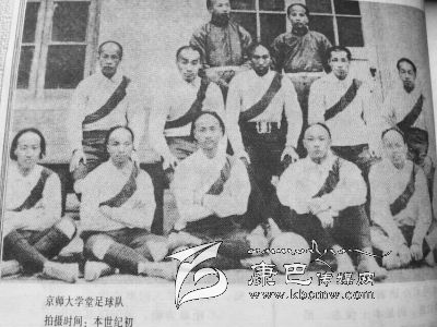 這是一張上個世紀初藏族人同英國人美國人在康巴高原踢足球的照片,地點是在川藏茶馬古道上的巴塘境內(nèi),從巴塘越過金沙江就是西藏地界。同樣的時間,京師大學(xué)堂(北京大學(xué)前身)建制完整的足球隊也為后人留下了一張同樣珍貴的合影照。