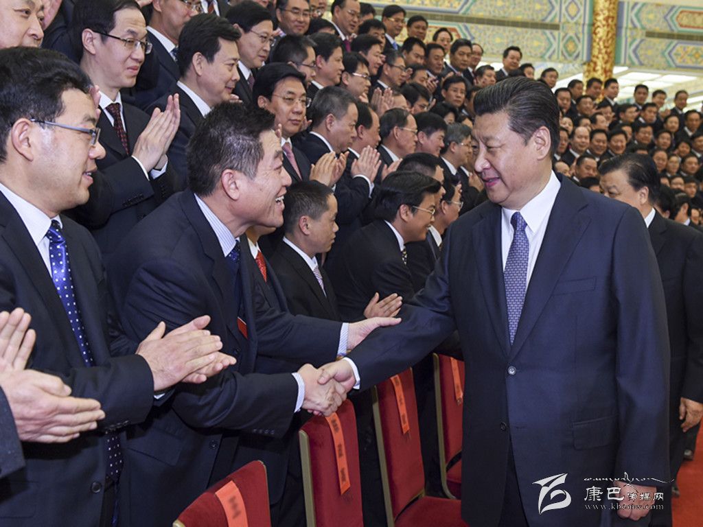 下午3時,習近平等來到人民大會堂金色大廳,同代表們親切握手,并合影留念。