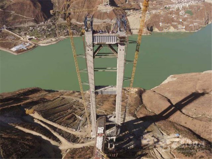 沿國(guó)道318線繼續(xù)往康定方向走,奔涌的大渡河鑲嵌在連綿起伏的山巒之間。車行一段距離后,矗立在河兩岸的兩座高聳的橋塔映入眼簾。這就是建設(shè)中的“川藏第一橋”——瀘定大渡河興康特大橋。