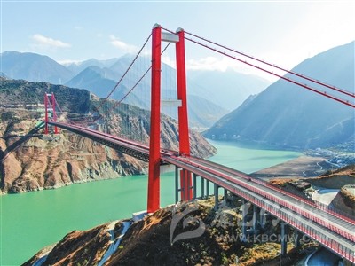 而在瀘定大渡河特大橋康定岸約200米處的公路堡坎上,寫著毛澤東主席的《七律·長征》一詩。一句“大渡橋橫鐵索寒”道出了大渡河的艱險,而如今,在這波濤洶涌的大河上,建起了如此雄偉的大橋,解決了出行難題,帶來了福祉,將促進(jìn)藏區(qū)經(jīng)濟社會發(fā)展,真是讓“高原人民盡開顏”。