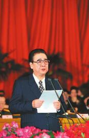 1998年3月19日,九屆全國(guó)人大一次會(huì)議在北京人民大會(huì)堂勝利閉幕。李鵬同志在閉幕式上講話。新華社記者 王巖 攝
