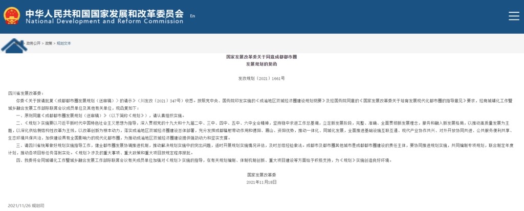 你委《關于報請批復〈成都都市圈發(fā)展規(guī)劃(送審稿)〉的請示》(川發(fā)改〔2021〕347號)收悉。按照黨中央、國務院印發(fā)實施的《成渝地區(qū)雙城經濟圈建設規(guī)劃綱要》及經國務院同意的《國家發(fā)展改革委關于培育發(fā)展現(xiàn)代化都市圈的指導意見》要求,經商城鎮(zhèn)化工作暨城鄉(xiāng)融合發(fā)展工作部際聯(lián)席會議成員單位及其他有關單位,現(xiàn)函復如下: