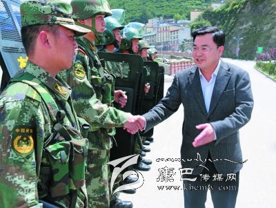 當(dāng)日下午3時許,318國道車水馬龍,川流不息。胡昌升來到公主橋交警治安崗?fù)ぃ瑢?shí)地檢查了周邊交通秩序維護(hù)和安保工作,并與正在執(zhí)行任務(wù)的交警和卡點(diǎn)上的武警官兵逐一握手。在詳細(xì)聽取了上勤時間、工作情況及針對車流量大的保通措施后,胡昌升對交管部門與武警部隊(duì)克服高溫天氣,密切配合共同做好周邊交通秩序維護(hù)和反恐維穩(wěn)工作表示充分肯定。