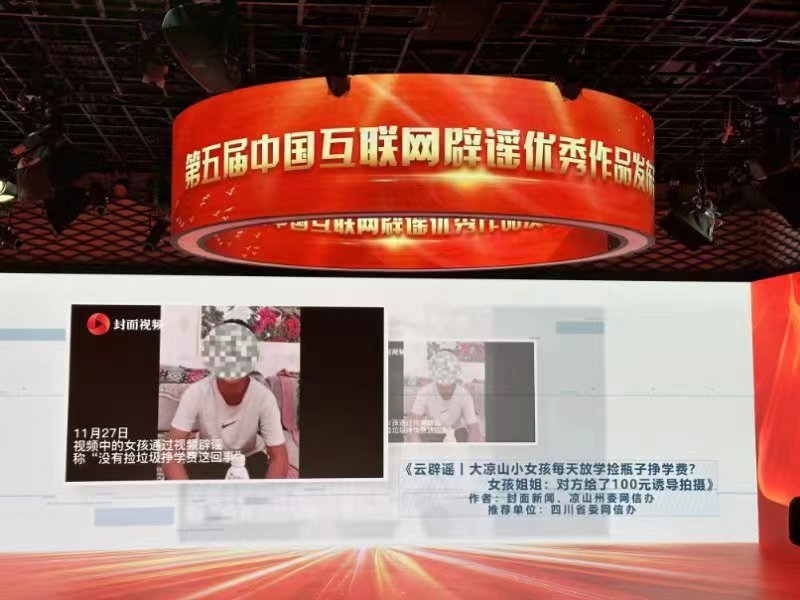 由涼山州委網(wǎng)信辦、封面新聞制作的《云辟謠 | 大涼山小女孩每天放學(xué)撿瓶子掙學(xué)費(fèi)?女孩姐姐:對方給了100元誘導(dǎo)拍攝》(點(diǎn)擊查看作品)獲得網(wǎng)絡(luò)辟謠版塊社會(huì)民生類獎(jiǎng)項(xiàng)。