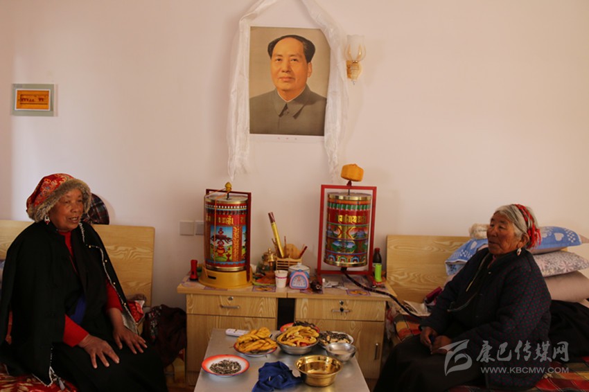 從餐廳出來,記者走進(jìn)了一間15平方米左右的宿舍。兩位老人正坐在各自的木床上看電視,墻上掛著的液晶電視是連著機(jī)頂盒的。兩床之間,放著藏桌和床頭柜,藏桌上有瓜子、花生、酥油果子、牛肉等食品,亞瑪翁青老人熱情地說:“因為正在過藏歷新年,這些都是福利院為我們備的年貨,你也嘗嘗!”。房間里最引人注目的便是掛在床頭柜上方的系著哈達(dá)的毛主席畫像,兩位老人指著毛主席畫像動情地說:“毛主席、共產(chǎn)黨是我們的恩人,看著他的畫像我們安心?!贝送猓块g里還有衣柜、配有馬桶的獨立廁所和盥洗臺,毛巾、漱口盅、掃把、拖把都整齊地放在對應(yīng)位置。亞瑪翁青笑著說:“我們住的房間都趕得上縣城里的賓館了?!?/span>