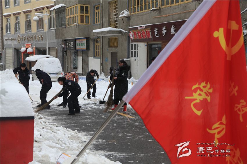 一陣鐵鏟的撞擊聲把記者吸引到了州公安局辦公大樓附近,大雪中,一面寫有黨員突擊隊(duì)字樣的紅旗格外引人注目。經(jīng)過(guò)訊問記者得知,這支鏟雪隊(duì)是由州公安局的黨員和民警組成的,因?yàn)橥k?,再加之發(fā)現(xiàn)辦公樓外的街道上積雪太厚,給行車、行人造成了不少麻煩,所以州公安局的黨員、民警組成了這支臨時(shí)突擊隊(duì),分成兩個(gè)小組分頭突擊。在他們身后,已經(jīng)有數(shù)百米街道上的積雪被清除。此外,在將軍橋附近,武警官兵也加入到清理積雪的行列,那道橄欖綠在雪中顯得格外美麗。