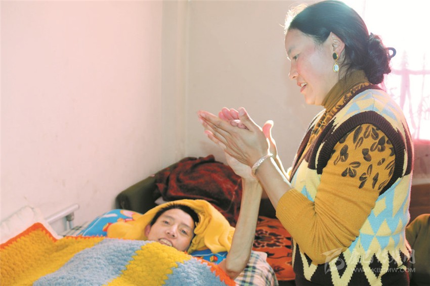 記者看到,根絨一家住的房子雖然簡陋,但卻充滿了愛意。每個(gè)房間收拾得整整齊齊,久病臥床的根絨雙目有神,衣著干凈,房間里聞不到任何異味。根絨笑著說:“都是我妻子的功勞,她愛干凈,每天都給我收拾得干干凈凈的。”