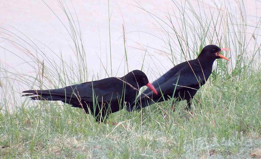 離開養(yǎng)老院,隊員們沿著小路漫步時,看見了大量的巖羊、狼和狐貍的糞便。當(dāng)隊員們正在十分愜意地欣賞著這里的美景時,隊員老蔣突然站在一塊巖石上大呼小叫起來,因為一只高原兔從他身邊跑過,嚇了一跳。隊員們隨著高原兔跑過的方向,抬頭向那陡峭的崖壁張望,希望能看到巖羊或雪豹的蹤跡,然而只看見一群紅嘴山鴉在追逐著一只乘風(fēng)盤旋的胡兀鷲。