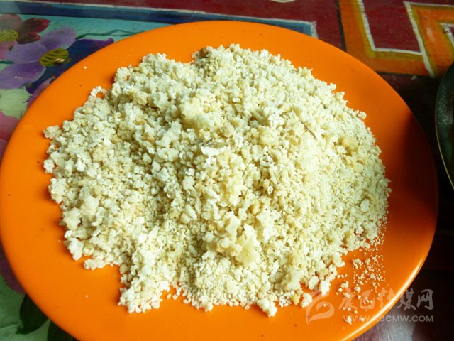 奶渣是奶提煉酥油后剩下的物質(zhì),經(jīng)燒煮,水份蒸發(fā)后,剩下是奶渣,奶渣可以做成奶餅、奶塊。在煮牛奶過(guò)程中,還可揭起奶皮,藏語(yǔ)叫“比瑪”。奶皮就像豆腐皮一樣,好吃又富有營(yíng)養(yǎng)。奶品是藏族的重要食品,家居或外出,人們都帶上它。在零食品種不多的藏區(qū),大人們常把奶渣給小孩當(dāng)零食。麻森在盤(pán)子里放上適量的糌粑、酥油、碎奶渣及碎紅糖,攪混揉合,盛入一方形小木盒內(nèi),用手塞滿、壓實(shí),即可制成麻森方形糕,其味香甜可口。