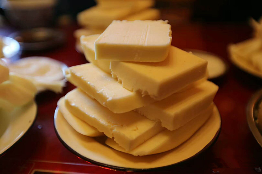 酥油是藏族民眾主要的食用油脂。藏族諺語說:“沒有駿馬的草原不美,沒有酥油的糌粑不香?!辈刈迕癖姶蛩钟筒琛⑷圄佤味茧x不開酥油。據(jù)史料記載,文成公主入藏時(shí),帶去了內(nèi)地的茶葉,公主“使乳變成奶酪,從乳取酥油”,有了茶和酥油,才有了酥油茶。